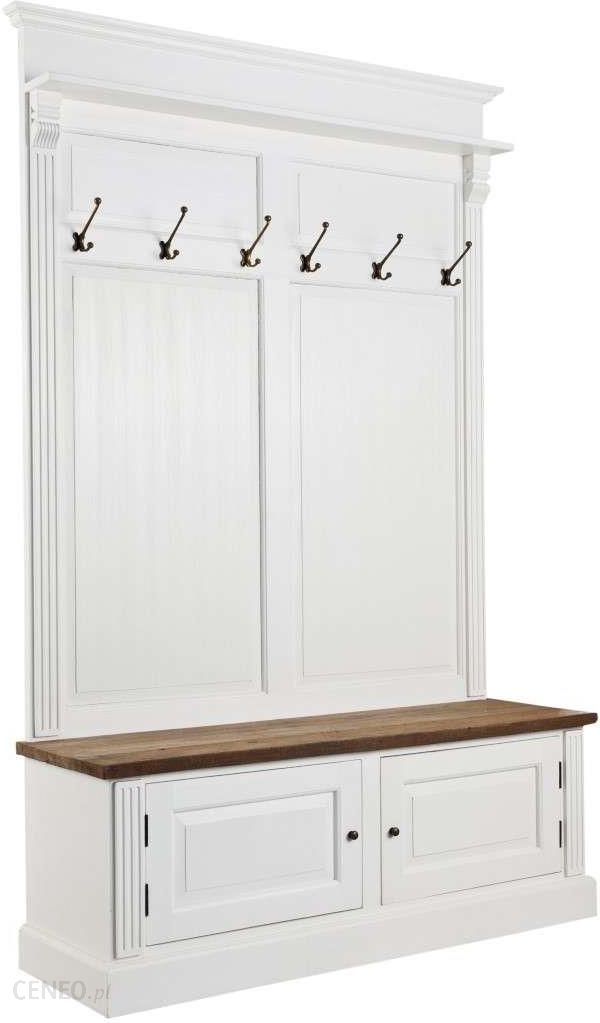 Piękny i praktyczny mebel do przedpokoju, wykonany z litego drewna malowanego na biało. Szafka dolna pomieści kilka par butów, siedzisko pozwoli nam wygodnie usiąść, u góry haki na powieszenie odzieży oraz półeczka na rękawiczki, szalik lub inne drobiazgi.